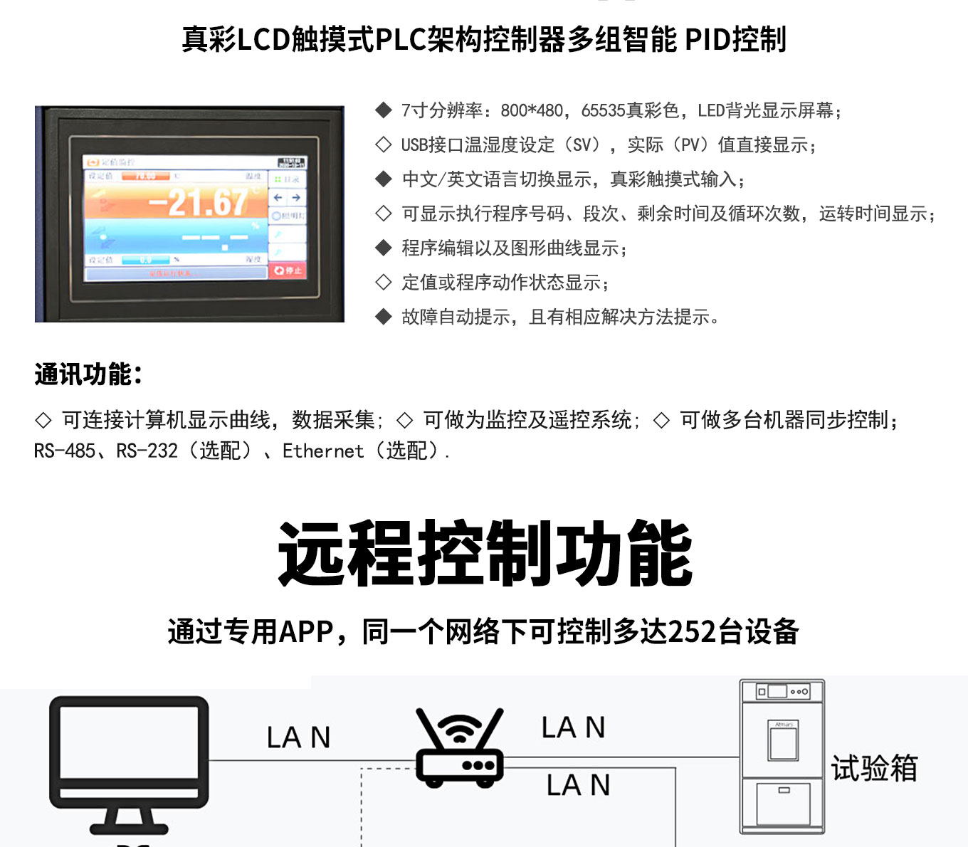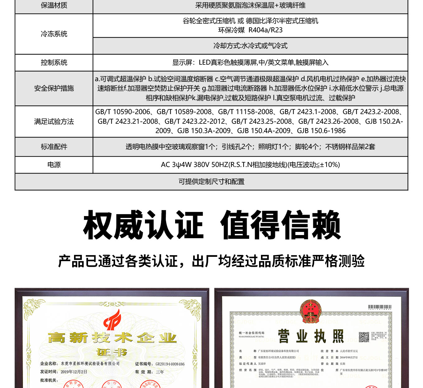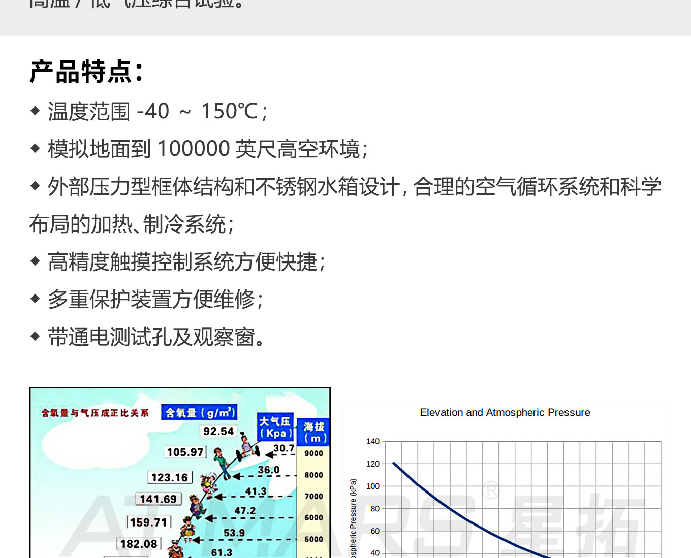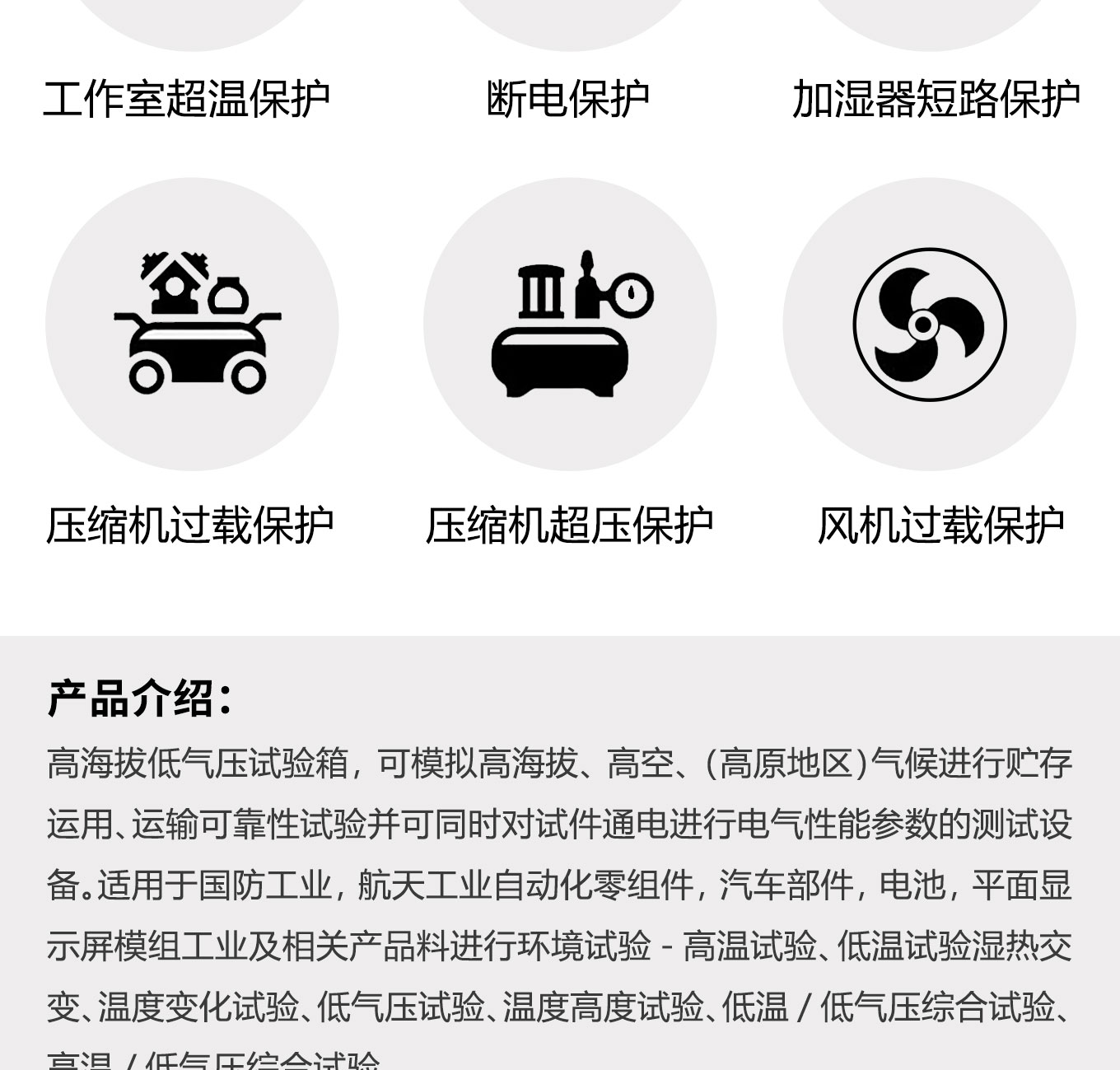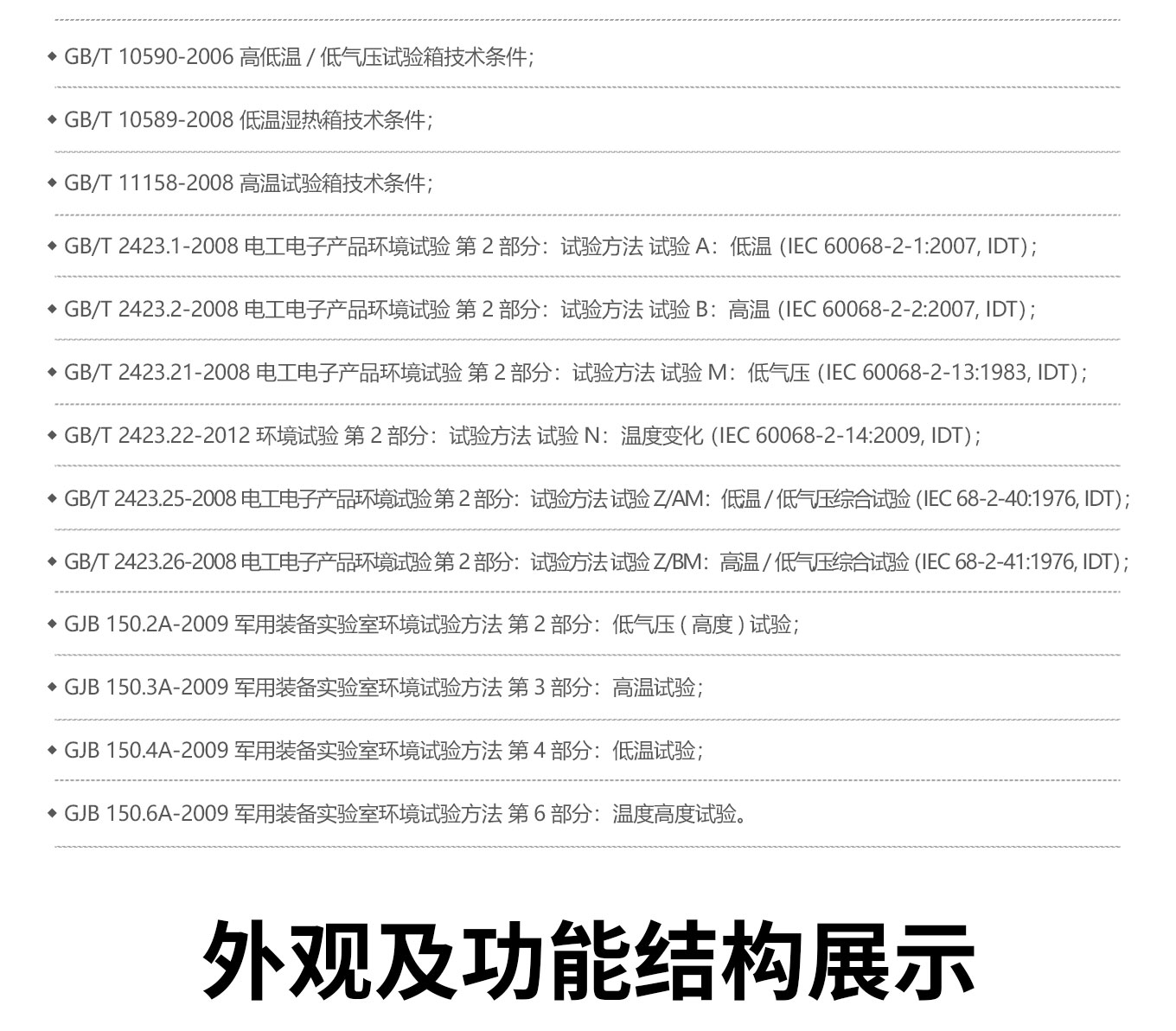 适用于国防工业,航天工业自动化零组件,汽车部件,电池,平面显示屏模组工业及相关产品料进行环境试验-高温试验、低温试验、温度变化试验、低气压试验、温度高度试验、低温/低气压综合试验、高温/低气压综合试验。