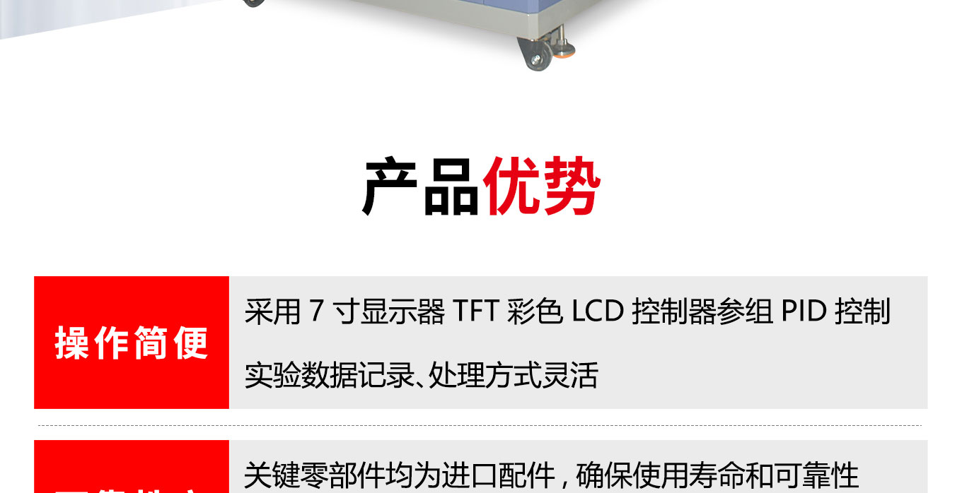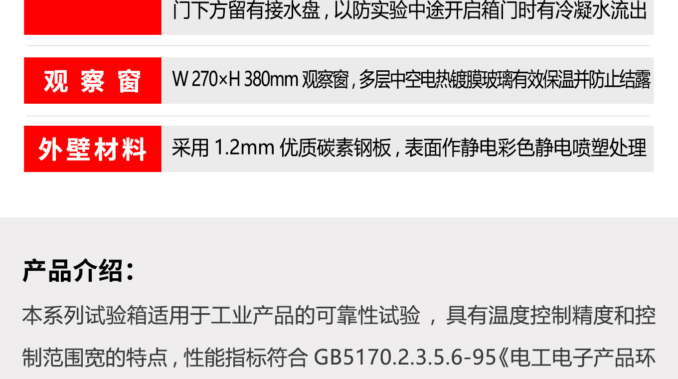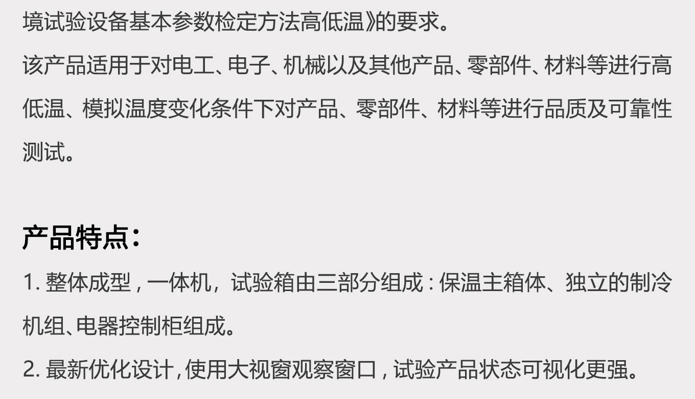 该产品适用于对电工、电子、机械以及其他产品、零部件、材料等进行高低温、模拟温度变化条件下对产品、零部件、材料等进行品质及可靠性测试。