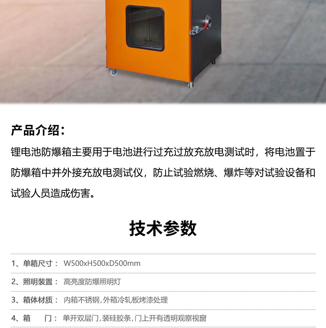 锂电池防爆箱主要用于电池进行过充过放充放电测试时,将电池置于防爆箱中并外接充放电测试仪,防止试验燃烧、爆炸等对试验设备和试验人员造成伤害。