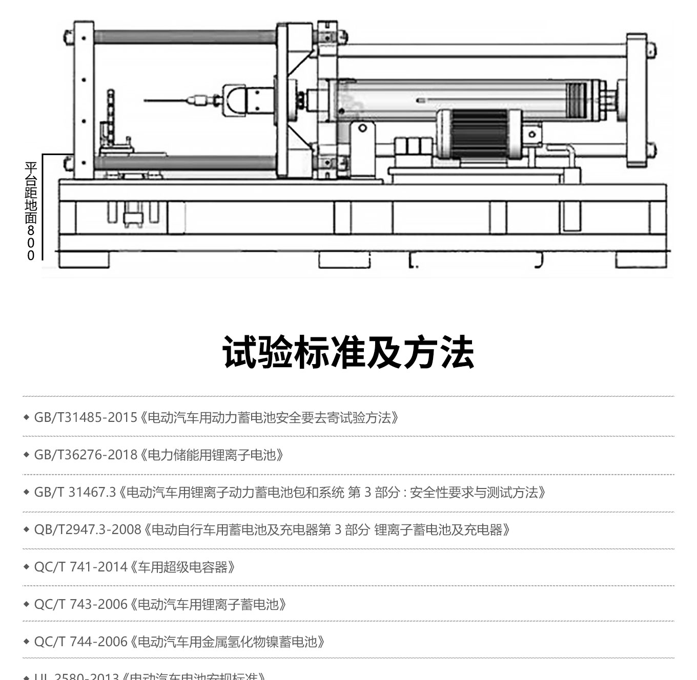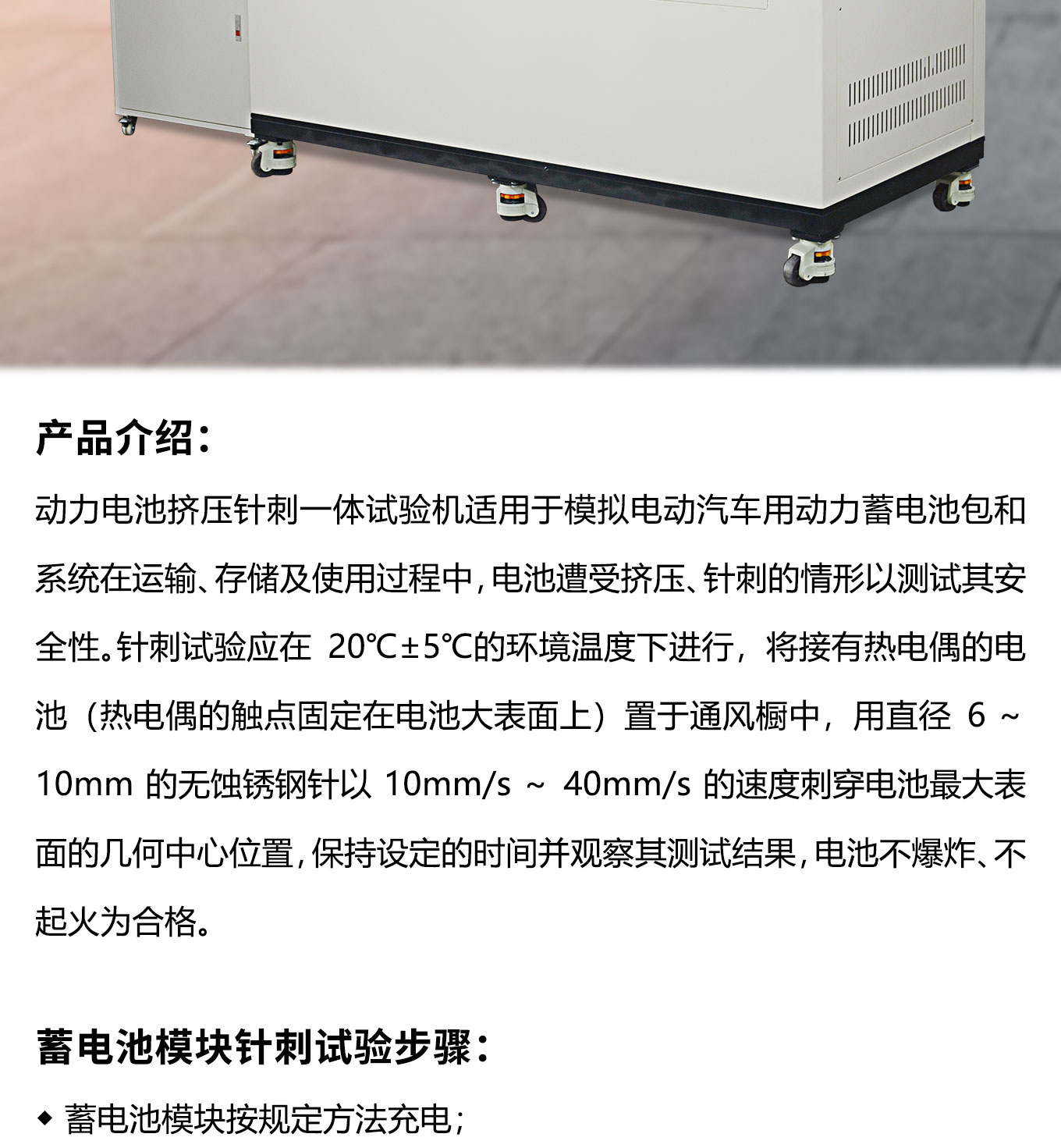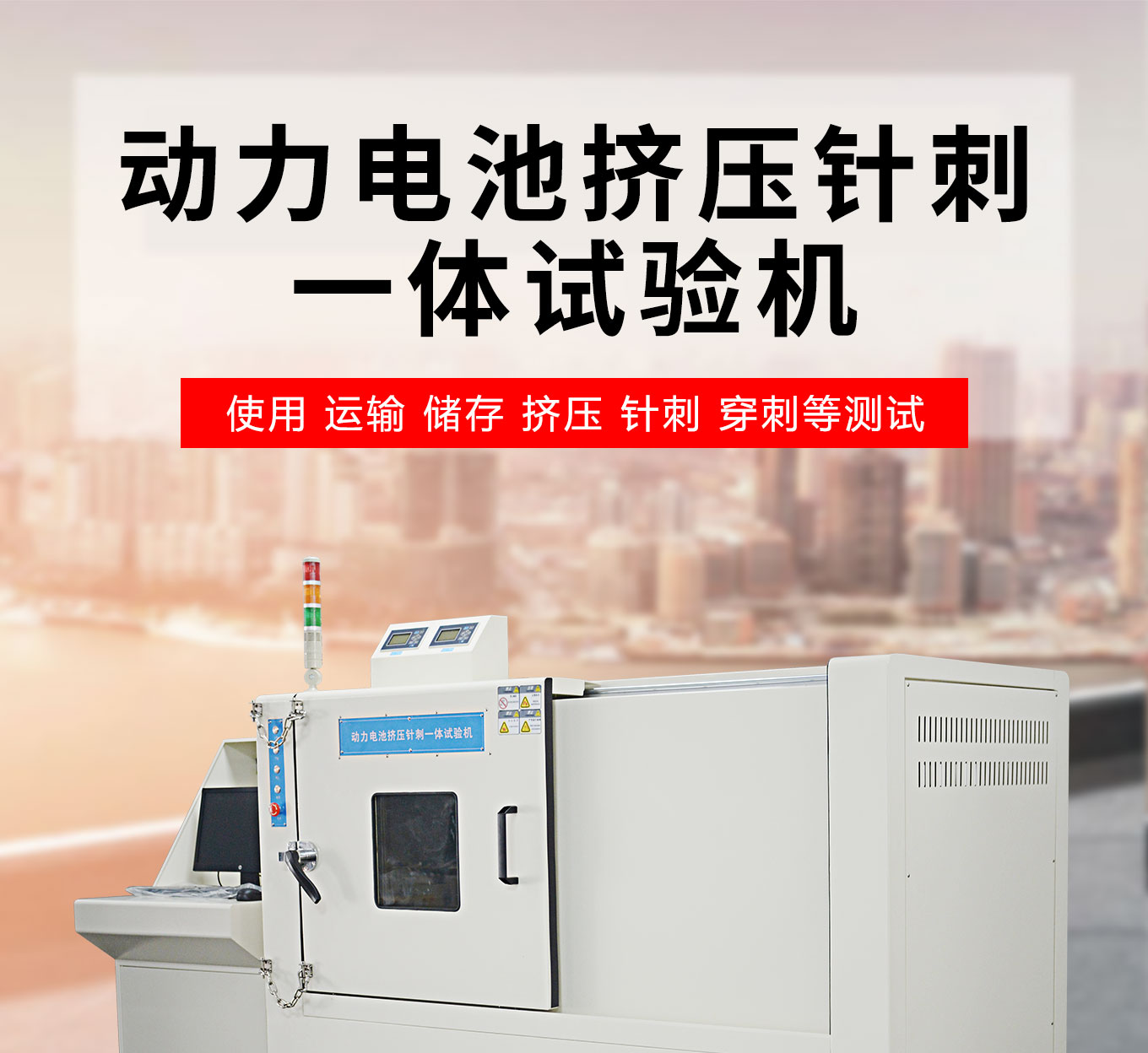 动力电池挤压针刺一体试验机适用于模拟电动汽车用动力蓄电池包和系统在运输、存储及使用过程中,电池遭受挤压、针刺的情形以测试其安全性。