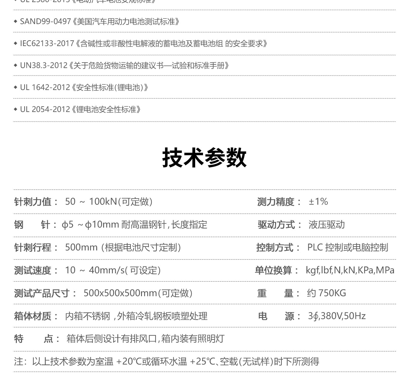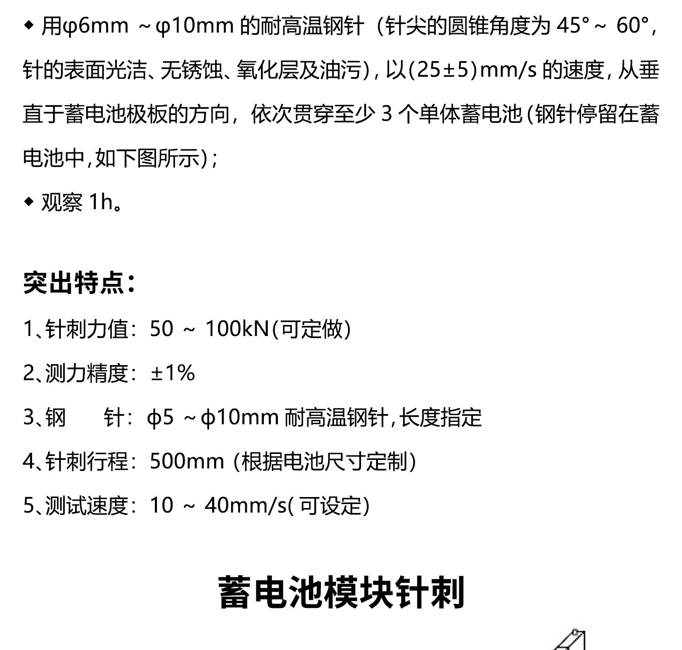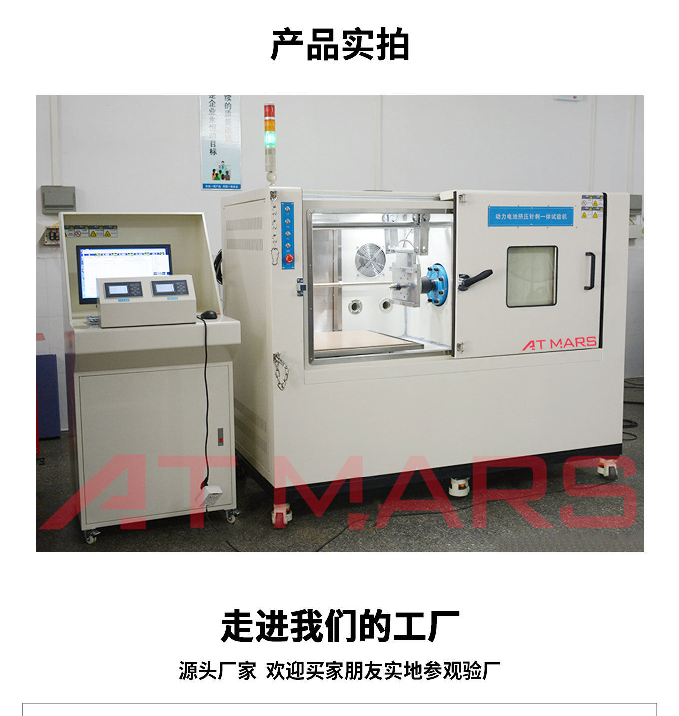 动力电池挤压针刺一体试验机适用于模拟电动汽车用动力蓄电池包和系统在运输、存储及使用过程中,电池遭受挤压、针刺的情形以测试其安全性。