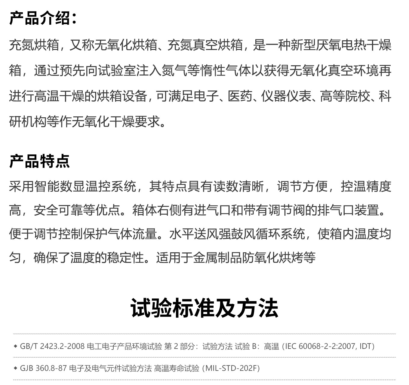 充氮烘箱,又称无氧化烘箱、充氮真空烘箱,是一种新型厌氧电热干燥箱,通过预先向试验室注入氮气等惰性气体以获得无氧化真空环境再进行高温干燥的烘箱设备,可满足电子、医药、仪器仪表、高等院校、科研机构等作无氧化干燥要求。